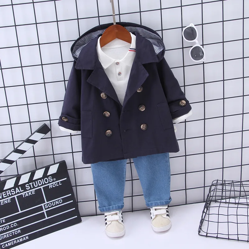 Best Chance for autumn Toddler baby boy clothes suit infant double-breasted hooded windbreaker+shirt+jeans 3pcs 0-4