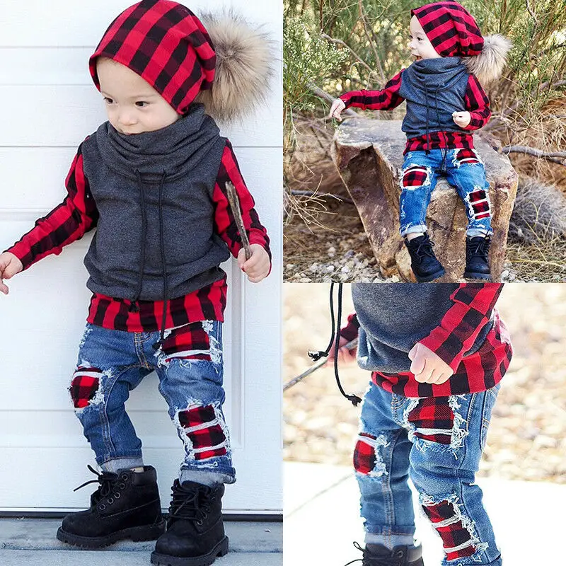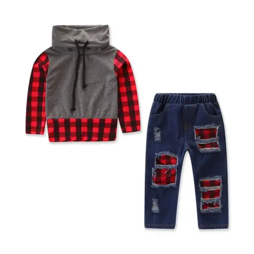 Good Price of Baby Boy Clothes Toddler Kids Baby Boy Plaid Tops Shirt Denim Jeans Pants Leggings Outfit Clothes