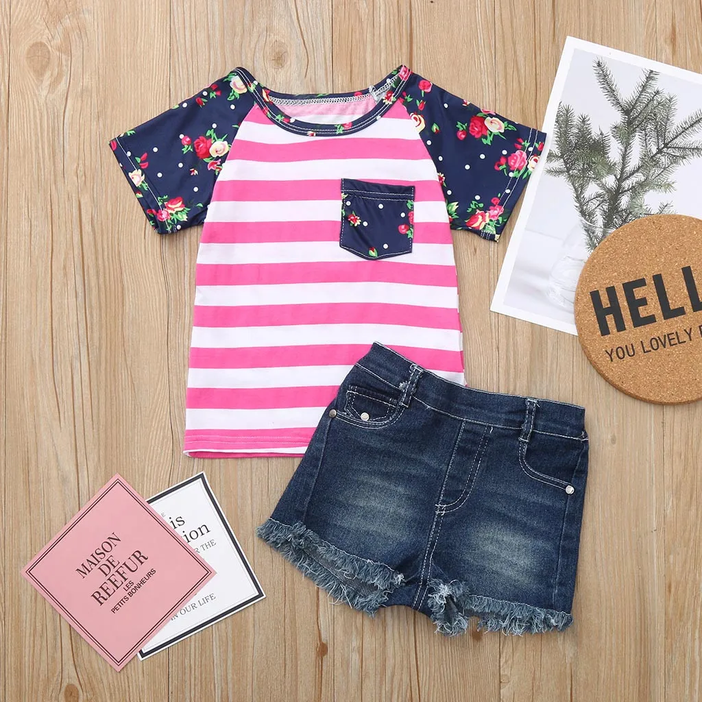 Good Chance for CHAMSGEND Toddler Baby Girls Cotton Blend Striped Floral Print Tops+Hole Denim Jean Shorts Outfits